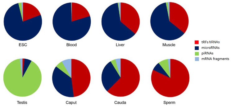 图4. tRF&tiRNA与其他相似尺寸小RNA之间的相对含量关系,在多种组织中,tRF&tiRNA的占较高甚至主要比例,这强烈预示了其重要的生理功能和生物标志物应用潜质。 |