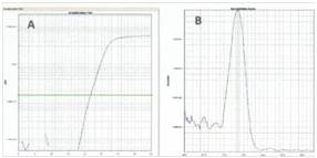 *图释:在血清样品中,使用miRStar™ 预验证的 hsa-miR-142-3p特异性PCR引物的实时定量PCR扩增曲线(A)和熔解曲线(B)。溶解曲线呈现锐利的单峰,表明了反应具有很高的特异性。