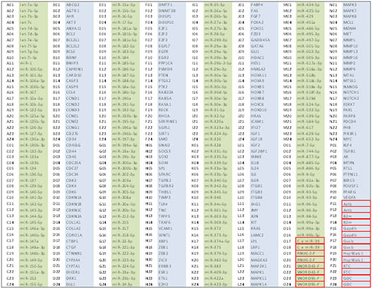 *图释:miRStar™癌症特异性microRNA & 靶基因 PCR芯片包含的microRNA(黄色背景),mRNA(紫色背景)和内参(红色方框。