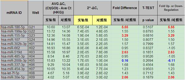 microRNA的qPCR数据展示在“microRNA expression data”数据表格中,表达有差异(>2倍)或有显著性(P<0.05)的数据用有颜色的字体标注,客户可以很方便的根据自身要求,利用倍数变化和P值在列表中筛选差异microRNA,常用筛选标准:倍数变化>2倍,P<0.05。