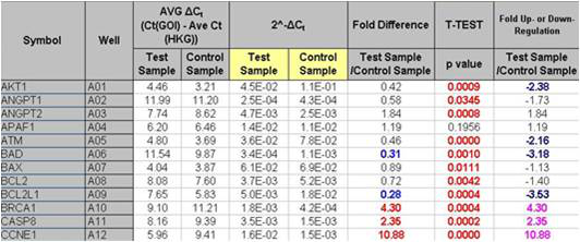 利用配套软件计算PCR芯片中的各个基因的Ct值,采用公认的ΔΔCt方法比较基因的表达变化。