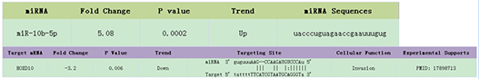 hjc黄金城还将差异表达的microRNA(一般筛选标准为:倍数变化>=2倍,P<0.05)与其靶mRNA的表达数据进行整合,相应的数据展示在“microRNA-mRNA data”数据表格中。如果microRNA的靶基因与其表达趋势相反,并且也在样品组间呈现出显著性的差异,那么在此类样品中这个靶基因可能是此microRNA真实的靶基因。microRNA与靶mRNA的作用位点,可能的细胞学功能,以及相应的实验证据来源也列在表格中。